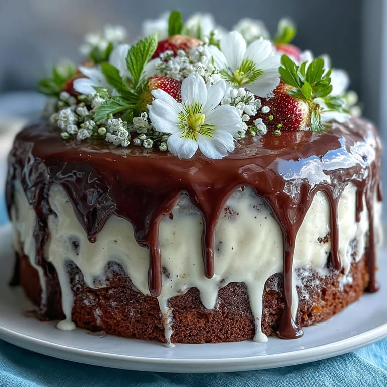 - Pour white chocolate drip over the top edge, letting it cascade, then crown with flowers and strawberries for ultimate spring flair.